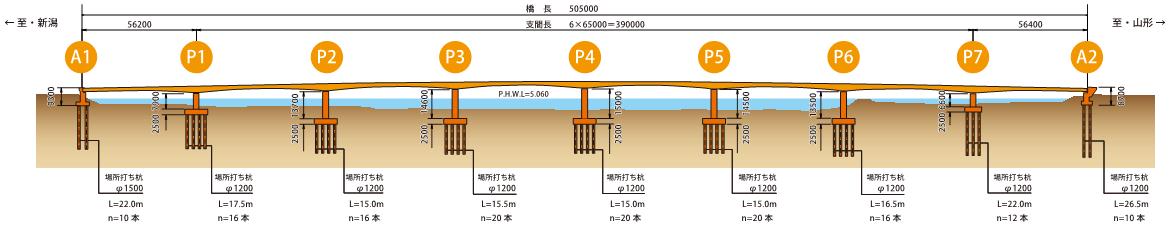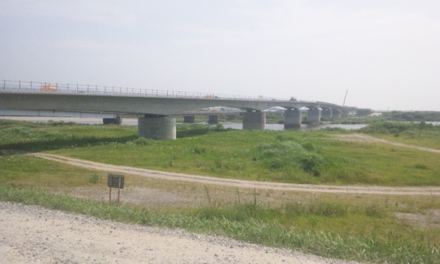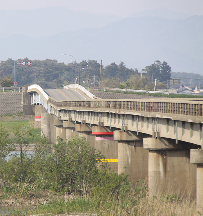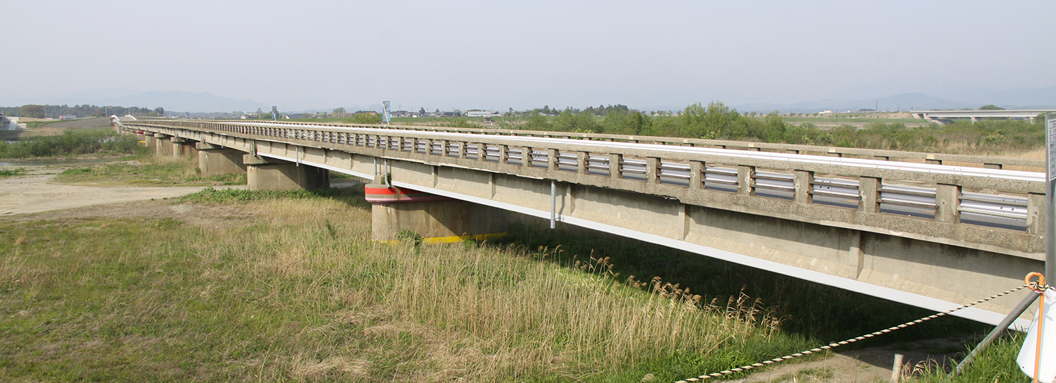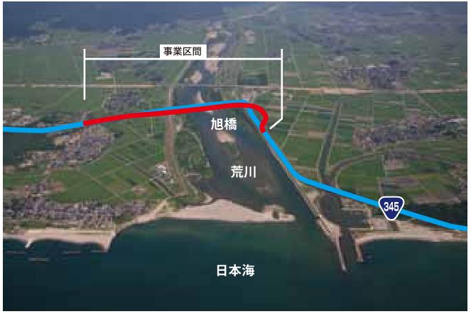 中田 橋梁やトンネルなど構造物を伴う事業を申し上げますと、国道345号旭橋の架け替え事業があります。今秋の開通を目指して事業を進めております。国道345号は海岸線に沿った路線であり、旭橋は荒川の最下流に渡河されている橋梁です。現橋は昭和34年に供用された橋梁(L=382.7㍍)ですが、供用後の河川改修で継ぎ足している部分(L=111.6㍍)があります。河川法が制定された昭和39年より前に架けられた橋であり、計画高水位よりも路面高が低い潜り橋であることから、荒川の洪水時には交通規制を余儀なくされています。また、供用後50年以上経過による老朽化や、日本海に面している塩害環境などにより、著しく損傷を受けています。そのため、現橋の下流部に新橋を建設しています。工事はすでに桁の架設を終えて、取り付け道路および橋面工を施工している状態です。