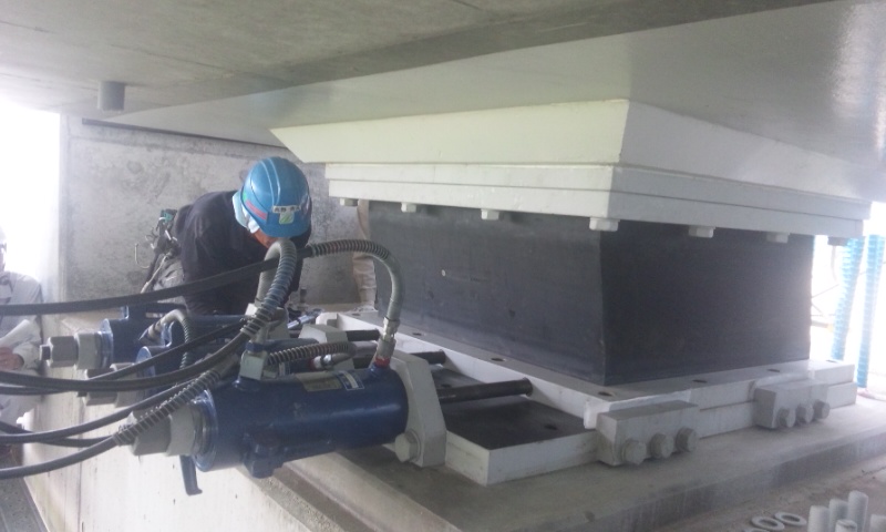 PCの主ケーブルは桁の内空断面の中に断面外から張り出して緊張する構造となっています。支承については、今回505㍍の連続桁であり、伸縮量は両端合わせて300㍉に達します。桁打設が終わっても桁収縮量が落ち着くのが最低でも1年かかると想定しており、完全に落ち着くには3年近くかかると言われています。300㍉というと打設後にすぐ伸縮装置を取り付けるわけにはいかないレベルの乾燥収縮量ですので、そちらに関しては、それを見越した形で桁を据えることが可能なポストスライド方式を採用しています。同形式は桁設置後に変位が生じたら、ジャッキで支承の下面プレートをスライドさせて、適正な位置に戻すという工法です。旭橋に関しては打設1年後(今年初め)に施工しました。実際の伸縮量は予想より少なく200㍉程度でした。