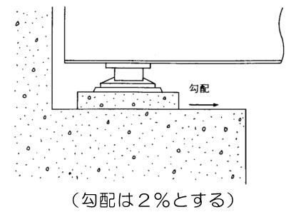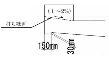 中田 高欄の外側から伝わってくる水が沓座などに到達しないように、地覆の裏側に水切りを設けるなど工夫を施しています。また、地覆施工時に段差を設けた上でドレーンを設置し、打ち継ぎ目に水が回らないようにテーパーをつけて継ぎ目部分に水がいかないようにしています。また、旭橋では残念ながら採用されていませんが、平成26年以降の設計分から橋座面にはかならず2%程度(道示では1%)の片側勾配をつけて水を流れやすくする規定を設けています。