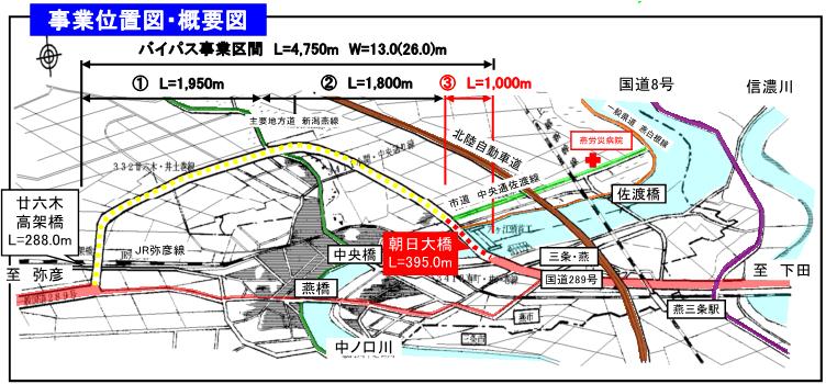 中田 国道289号の燕北BP事業において、信濃川支流中ノ口川渡河部に(仮称)朝日大橋の建設を進めています。国道289号は新潟市と福島県いわき市を結ぶ第2次緊急輸送道路に指定された区間でありますが、燕市東太田~井土巻までは、三条市と燕市中心部を結ぶ通過交通と市街地に流入する交通が混在するために慢性的な渋滞区間となっています。燕北BP事業はその通過交通を分散し渋滞を緩和することや通学路の安全性を確保することが目的です。同時に北陸自動車道三条燕ICとJR燕三条駅のアクセスも強化されます。