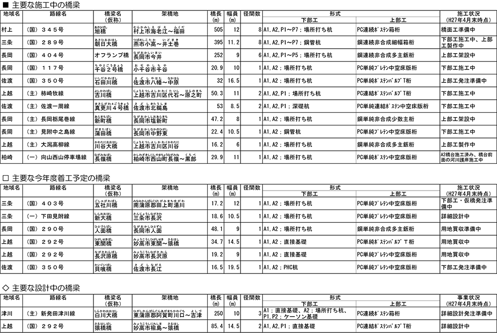 中田 施工中の橋梁は、旭橋、朝日大橋を入れて11橋あります。但し100㍍を超える長大橋は先の2橋を除いては国道404号の長岡市内に架設している(仮称)オフランプ橋のみで、後は全て100㍍以下です。