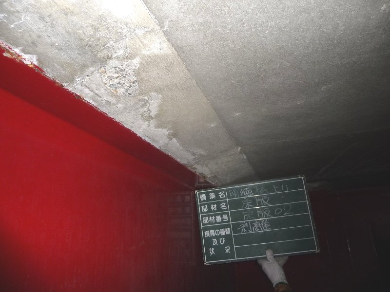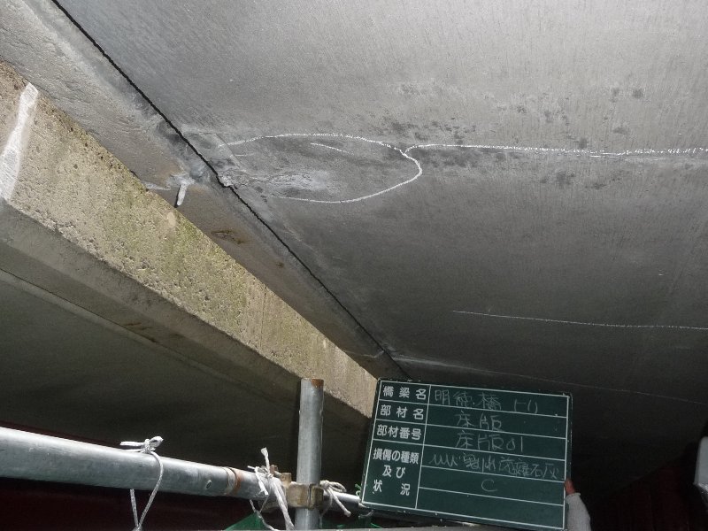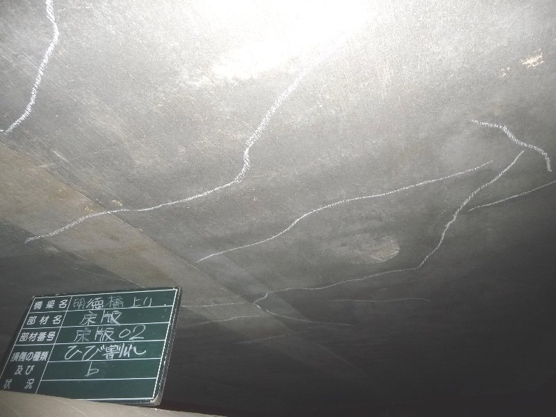 床版のひび割れ、遊離石灰(いずれも明徳橋)