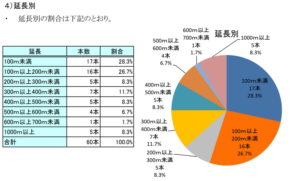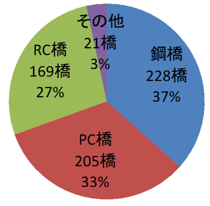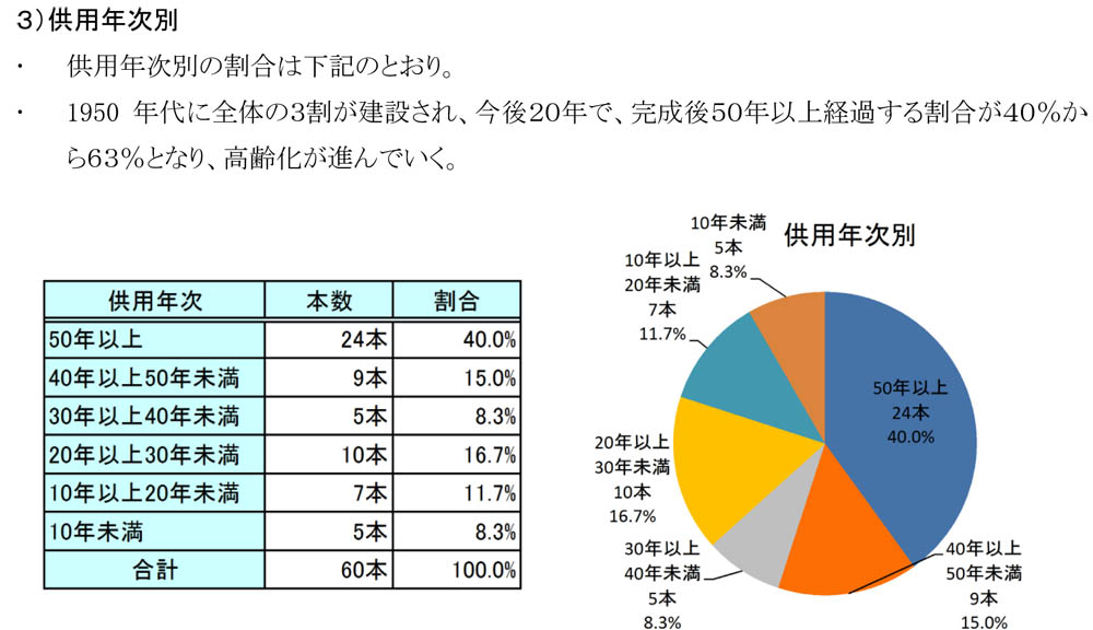 橋長別では50㍍超が9%、うち100㍍超の長大橋が全体の4%となっています。路線別では一般国道で約800橋、主要地方道で約1,300橋、一般県道で約2,300橋となっています。面白いのは各路線ごとの道路延長の比率と一致した数字になっている点でしょうか。ほぼ1㌔に1か所橋梁がある状況です。路線の規格によって橋梁の密度が変わっているということはほぼありません。