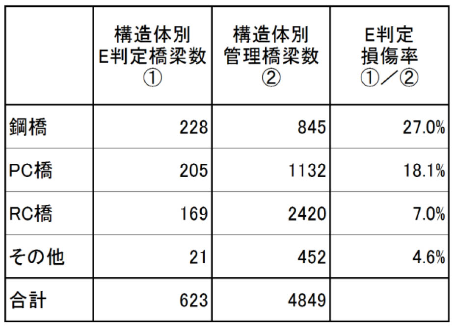 E判定損傷の内訳は、橋種別では37%が鋼橋(RC床版も含む)、PC橋33%、RC橋27%、その他3%となっています。これを橋種ごとの橋数で除し、E判定損傷率を見ると、鋼橋が27%、PC橋が18.1%、RC7%、その他4.6%となっており、重大な損傷は必ずしも橋齢によって進むのではなく、橋種や橋種に影響を与える橋長、架設位置や交通量、河口に近い橋であれば上流か下流かなど設置環境が大きく影響するものと考えられます。今後、これらの劣化状況と設置環境の関連について分析していく方針です。