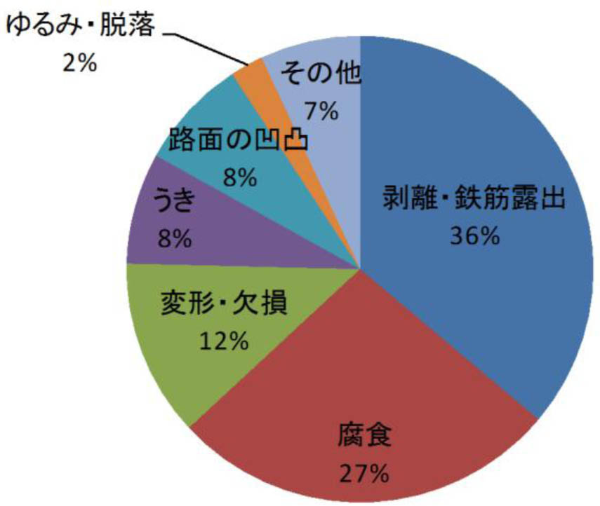 損傷種類別の発生割合に着目(E判定の623橋ベース)すると、コンクリート部材の「剥離・鉄筋露出」が約4割と最も多く、発生部位は、主構(コンクリート橋の主桁、横桁、床版橋など)、躯体(橋脚、橋台)、床版に多く見られます。次に「鋼部材の腐食」が約3割を占め、発生部位は支承、鋼製高欄、主構の順に多く見られます。また、変形・欠損は約1割を占め、伸縮装置、舗装で発生しています。次いで「コンクリートの浮き」、「路面の凹凸」、「ボルトの緩み・脱落」の順となっています。