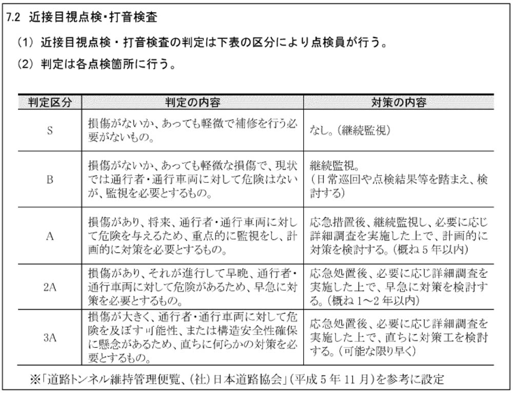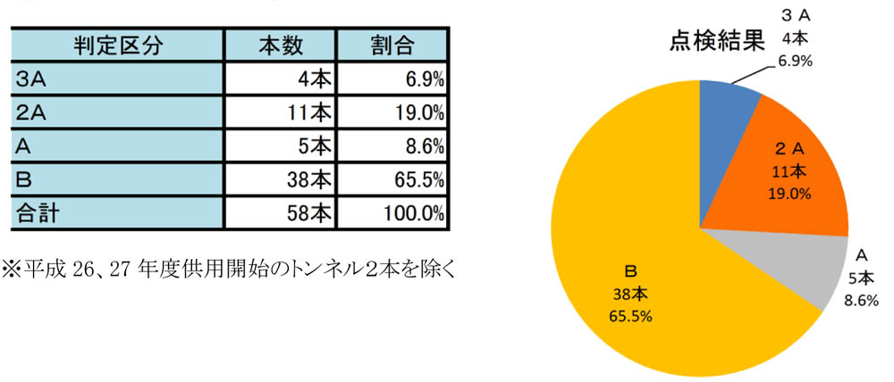 点検の結果、判定区分3A(早急に要対策)4本、2A(2年以内に対策)11本、A(同5年以内)5本の計20本において、補修を行う必要があると判断し、要対策と判定された全てのトンネルについて、今年度で対策を完了する予定です。
