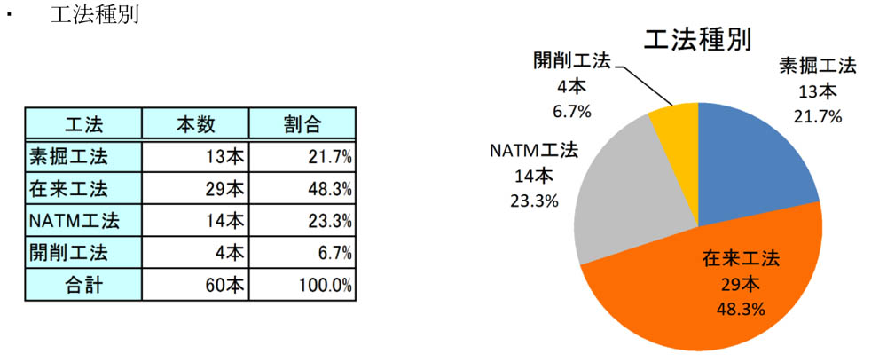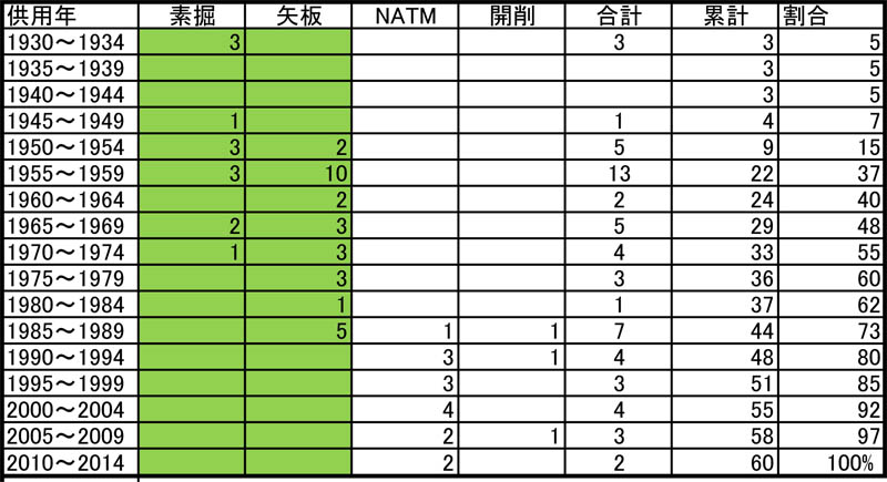 山田 当県が管理するトンネルは現在60か所あります。工種は素掘りが約2割、在来(矢板)工法が約5割、そしてNATMで2割強となっています。供用年次別は50年超が4割と橋梁に比べて高齢化率が高くなっています。トンネルは1955年からの5年間に建設のピークがあり、その後、1989年にNATMを導入してから以降後、長大トンネルの建設が増えています。