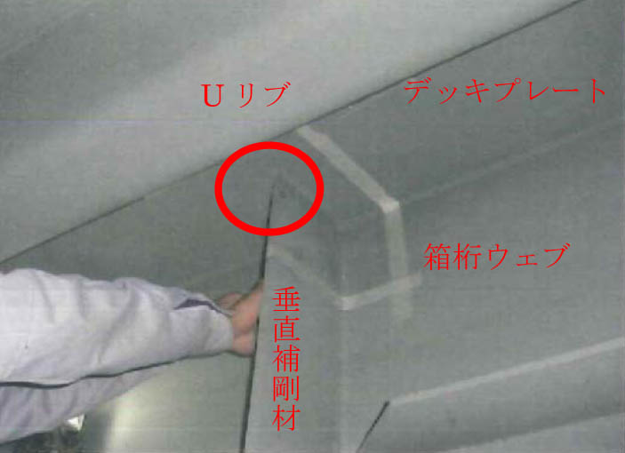 鋼床版の疲労亀裂による損傷事例は2橋あります。一つは、衣浦大橋上り線(橋長413㍍、鋼床版箱桁)でUリブ突き合わせ部に亀裂が生じていました。もう一つが、木曽川に架かる立田大橋(橋長966㍍、鋼床版箱桁)で、鋼床版と垂直補剛材の溶接部に亀裂が生じていました。また1個所ですがデッキプレートを貫通する亀裂もありました。