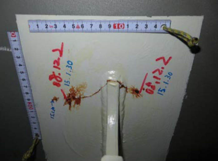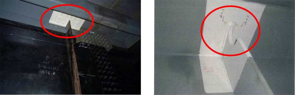 写真13、14 垂直補剛材とデッキプレート接合部の亀裂