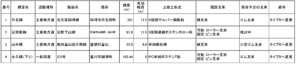 今年度は岡崎市の日名橋で線支承をゴム支承に、豊田市の足助新橋(支承種類は検討中)、豊根村の山中橋で線支承を小型ゴム支承に、豊川市の永久橋(下り線)でローラーおよびピン支承をゴム支承にそれぞれ取替える予定です。