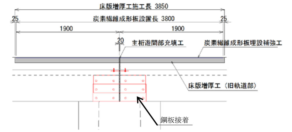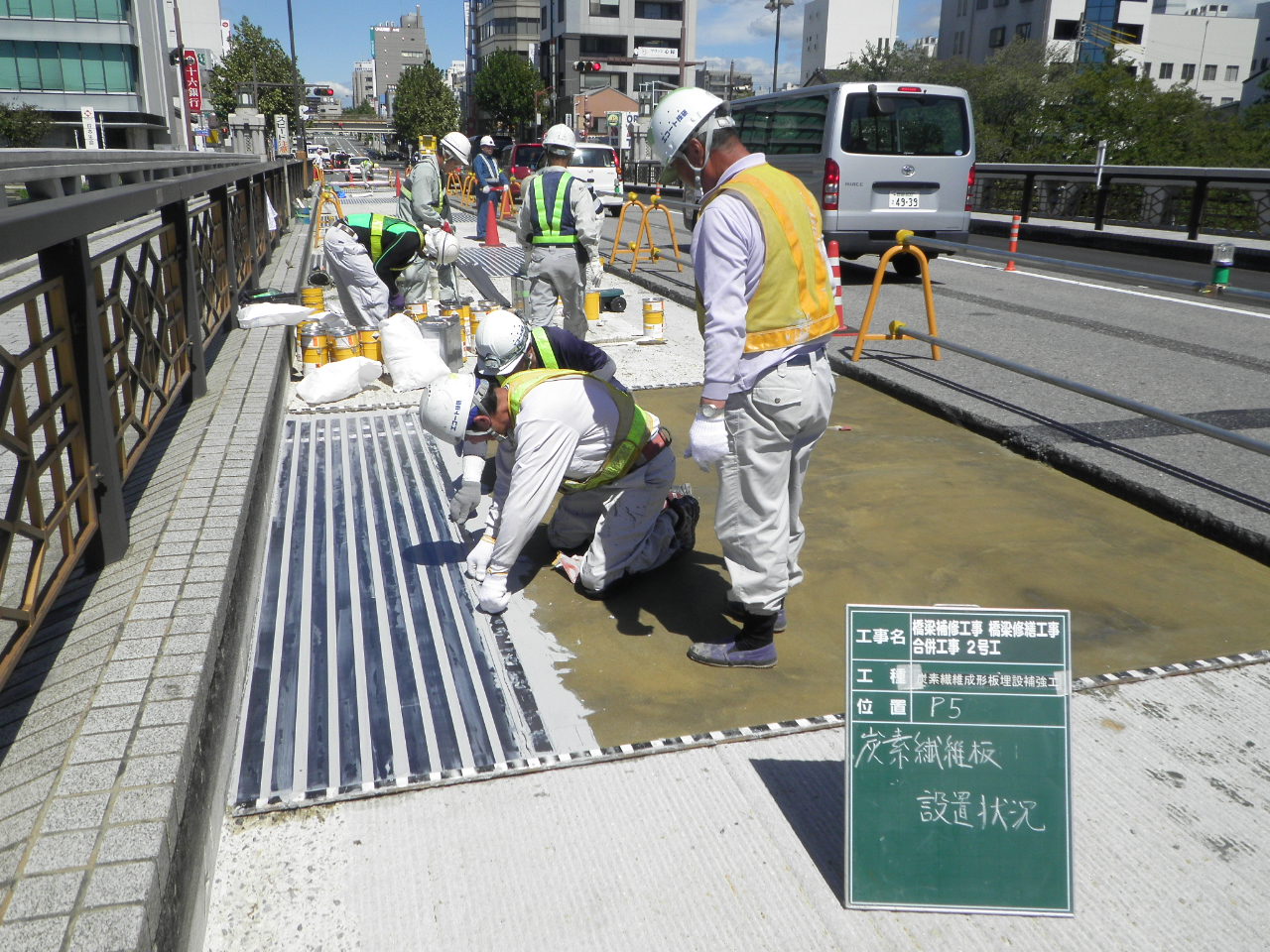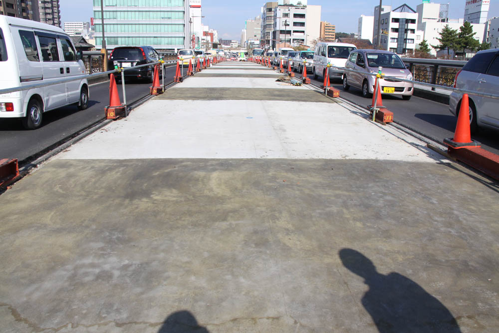 ノージョイント化は一般県道岡崎幸田線の殿橋(RC単純T桁12連、約113㍍)で炭素繊維成形プレートおよび鋼板接着により上部構造を連結する工事を施工中です。同橋は元々岡崎市電の橋梁として昭和2年に供用され(市電は戦時中の空襲で焼失し、その後は道路橋として活用)、約90年を経過しています。今回の工事では旧軌道部の床版増厚も行っています。