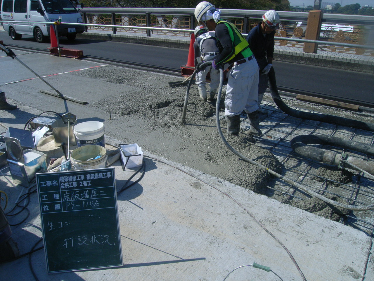写真21 殿橋の補強(褐色部は上面を炭素繊維プレートで補強、白色部はSFRCで増厚補強、写真左)