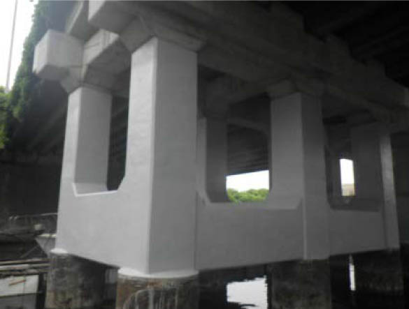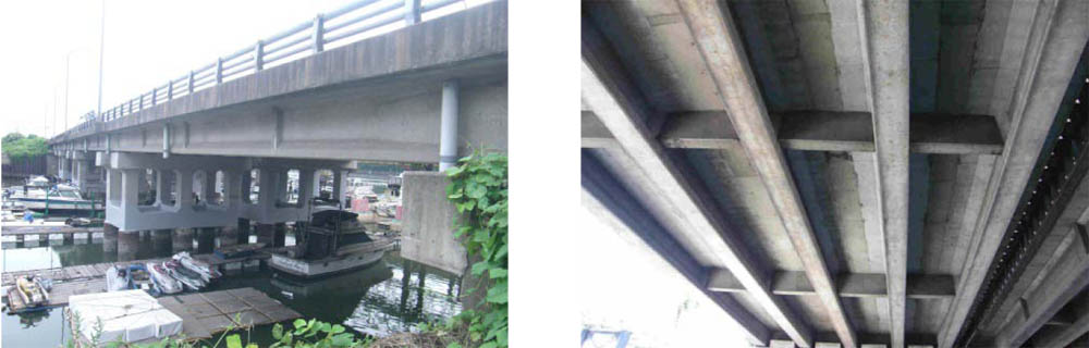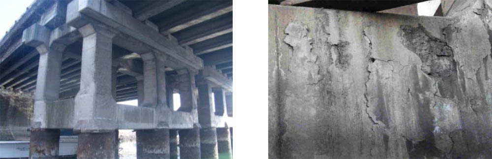 今年度は、塩害による鉄筋膨張、コンクリートの浮き剥離が生じている田原市の大山川橋で断面修復工を施工する予定です。また、対策時期は未定ですが、橋脚、橋台がASRにより損傷している高浜市の国道247号汐留橋では、ひび割れ注入工および表面含浸工を施工する予定です。
