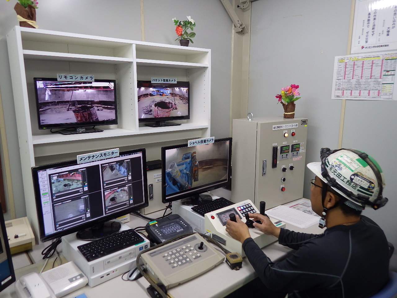 遠隔操作により施工する(左)/ケーソン内部は無人施工(右)