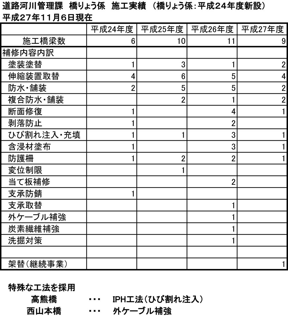 現在までに平成24年度で6橋、25年度で10橋、26年度で11橋、27年度(11月6日現在)で9橋対応しています。(内容は下表)