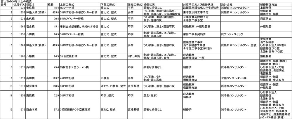 富山市の30年以上を経過した主要橋梁
