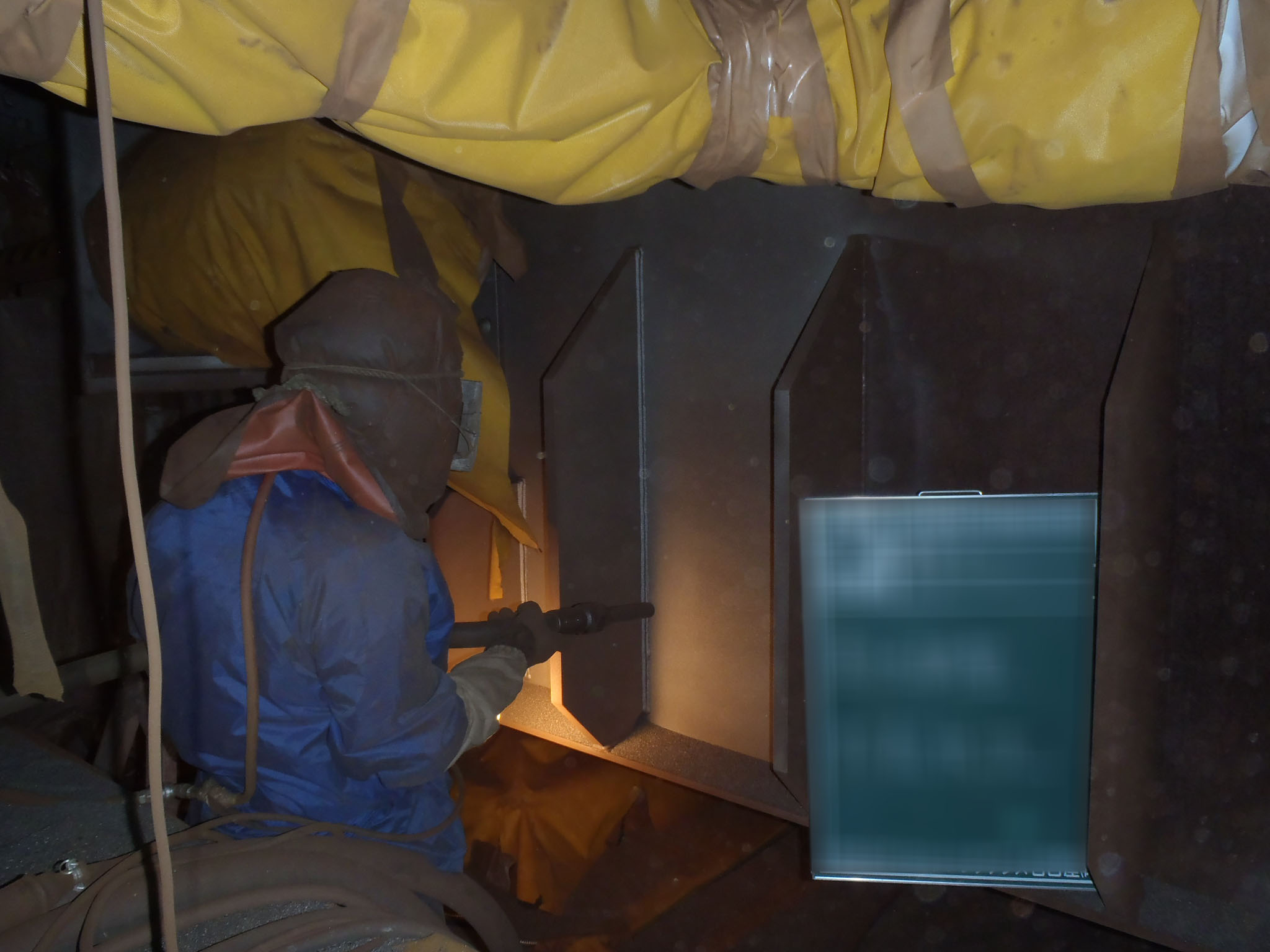 耐候性鋼材橋梁で損傷した箇所のブラストも行っている(上下とも施工例)
