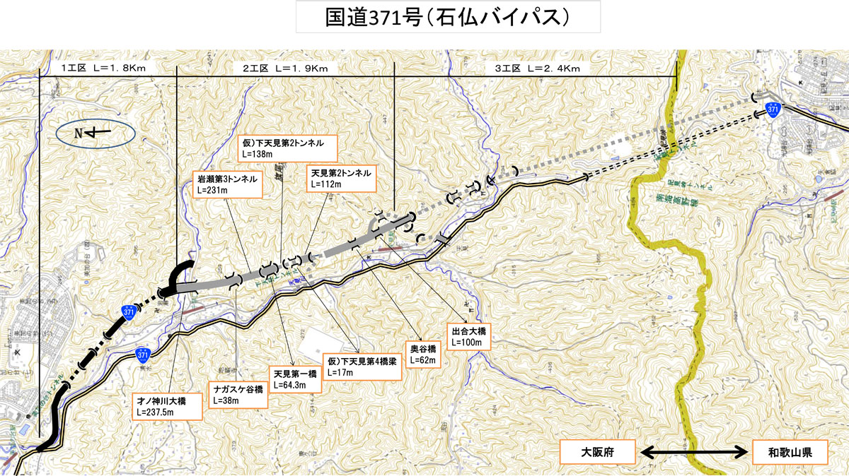 久保 京奈和自動車道へアクセスする南北道路について、大阪府では(和歌山県との)府県間道路の整備で、現在手がけているのは2路線です。1つ目は、国道371号の大阪府河内長野市~和歌山県橋本市を結ぶバイパス道路の建設を進めています。同路線は橋やトンネルなどの構造物が多数存在します。(下MAP参照)