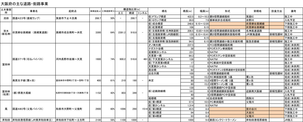 久保 大阪府は、池田(豊能地域)、茨木(三島地域)、枚方(北河内)、八尾(中河内)、富田林(南河内)、鳳(泉北)、岸和田(泉南)の7土木事務所に分かれて、それぞれの道路事業を所管しています。主な構造物の建設を行っている5事務所の紹介をします。