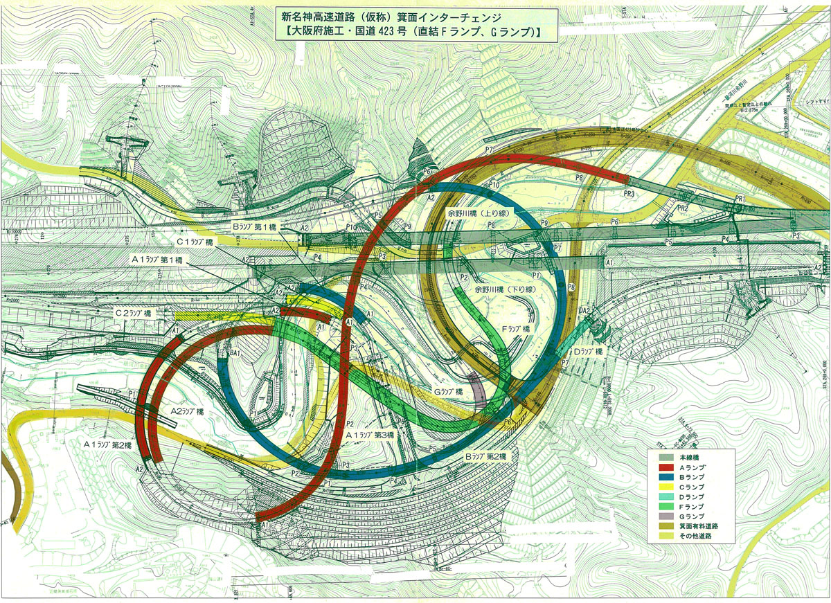 久保 新名神高速道路への直結ランプとして国道423号の整備が進められています。箕面グリーンロードは大阪府道路公社が直近まで整備を完了しており、府は新名神とグリーンロードとの直結ランプを整備しています。橋梁は(仮称)箕面IC付近に建設されるFランプ橋と、余野川渡河部に架橋されるGランプ橋があります。Fランプ橋は非常に小さなR(曲率半径50㍍)を有しており、鋼9径間連続箱桁(橋長422.5㍍)で、NEXCO西日本に委託して工事を進めています。Gランプ橋(鋼単純非合成箱桁、39㍍)は今後発注予定です。
