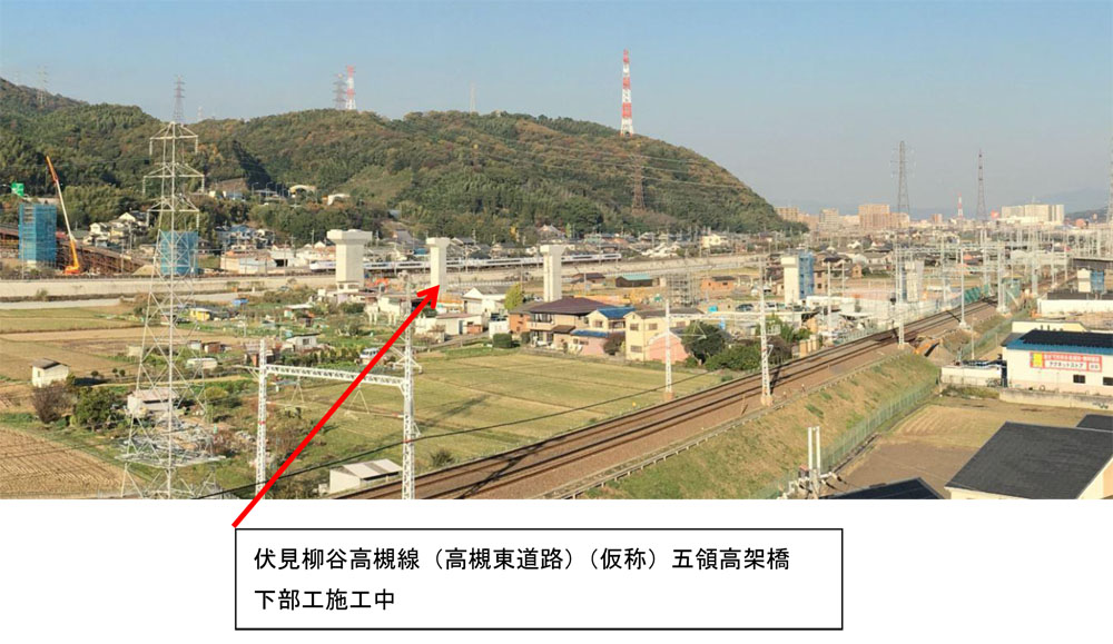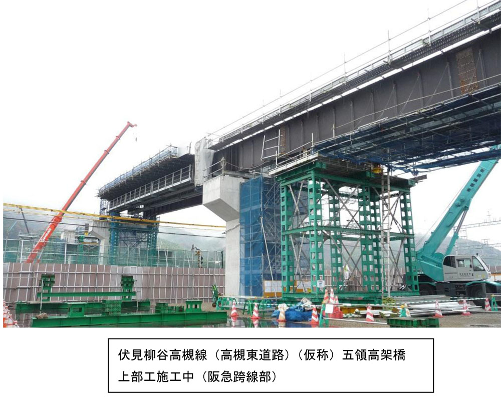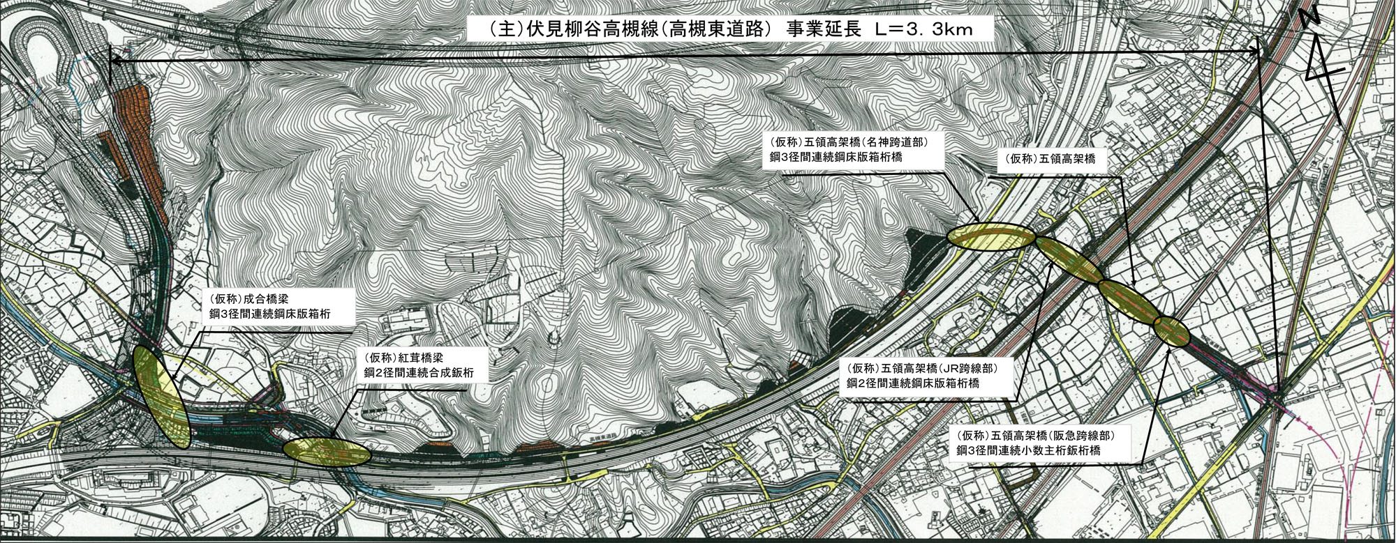橋梁は6橋を予定していますが、現道の伏見柳谷高槻線を跨ぐ橋梁が2橋あるほか、JR東海道本線、名神高速道路、阪急京都線などを跨ぐ橋梁があります。名神高速道路に沿って拡幅しつつ、山から平野に下りるように橋梁を建設する構造になっています。橋梁は全て(スパン割や架設を考慮して)鋼桁としています。