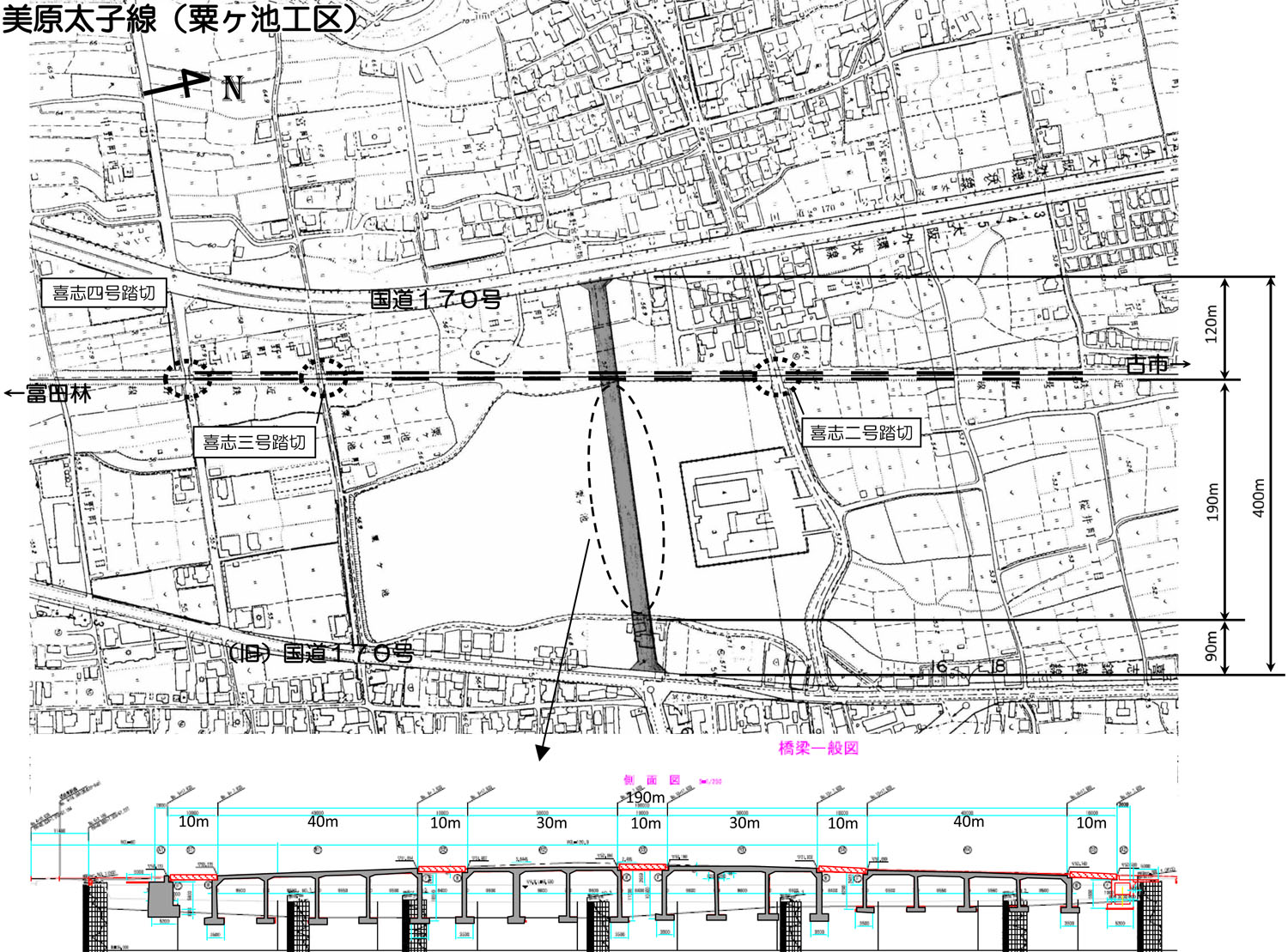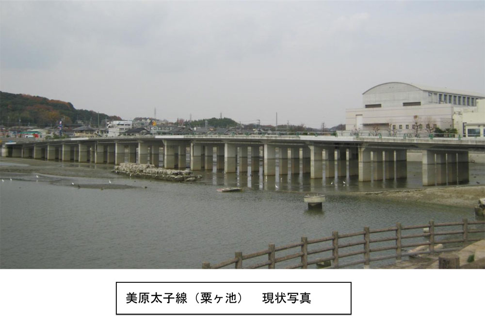 もう1つは富田林市の美原太子線の粟ヶ池工区(左MAP参照)ですが、府道美原太子線と国道170号(大阪外環状線)を繋ぐために建設中の道路事業です。現在は旧国道170号との交差点までが完成し粟ヶ池の未整備区間は、粟ヶ池を渡って近鉄長野線と交差して国道170号に接続する道路です。現在、粟ヶ池を渡る橋梁は概成していますが、国道170号の東側に近鉄長野線が並行して通っているため(現在のままでは)踏切が必要になります。そのため、近鉄長野線の一部を高架化する予定です。現在は、仮線を池側に振って(池側を埋め立ててヤードを作り)現在線を高架化する工事の準備を始めていますが、鉄道高架化には時間がかかるため、暫定的に鉄道交差部に踏切を設置して国道170号(外環状線)に接続する予定です。