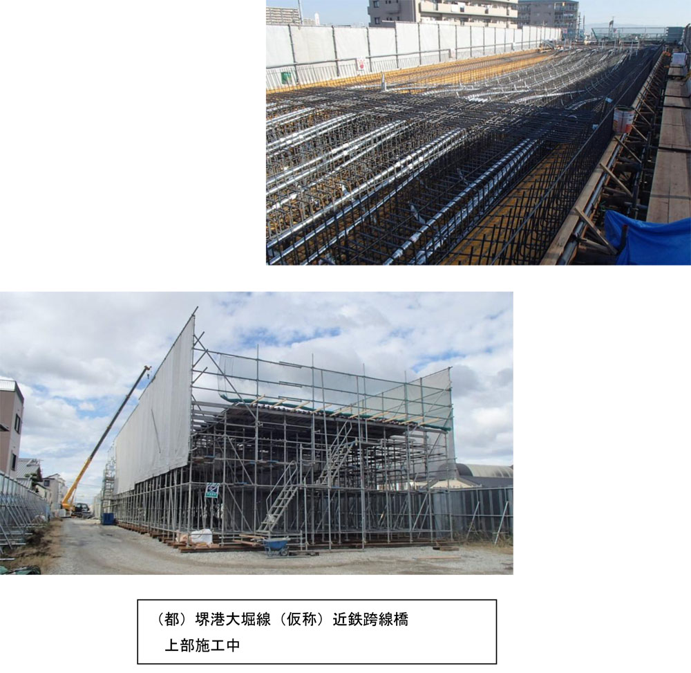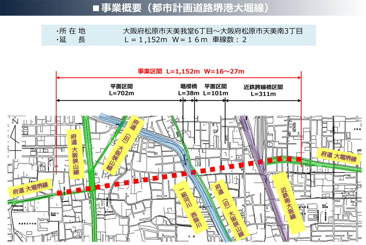次に堺港大堀線です。松原市内西側を南北に走る府道大阪狭山線と同様に同市中央部を南北に通る国道309号へ東西に結ぶ1,152㍍の道路です。西側の平面部702㍍と西除川渡河部の堀櫻橋(38㍍)は今年度末に供用する予定です。現在施工しているのは、残る平面部101㍍と近鉄南大阪線を跨ぐ跨線橋(311㍍)です。同橋は両サイドがPC中空床版で、近鉄南大阪線直上は3径間連続鋼床版箱桁(耐候性鋼材)を採用しています。現在は下部工を施工中で、これから上部工の製作に入っていきます。架設方法は送り出しを予定していますが、鉄道直上の施工は近畿日本鉄道(株)に委託します。