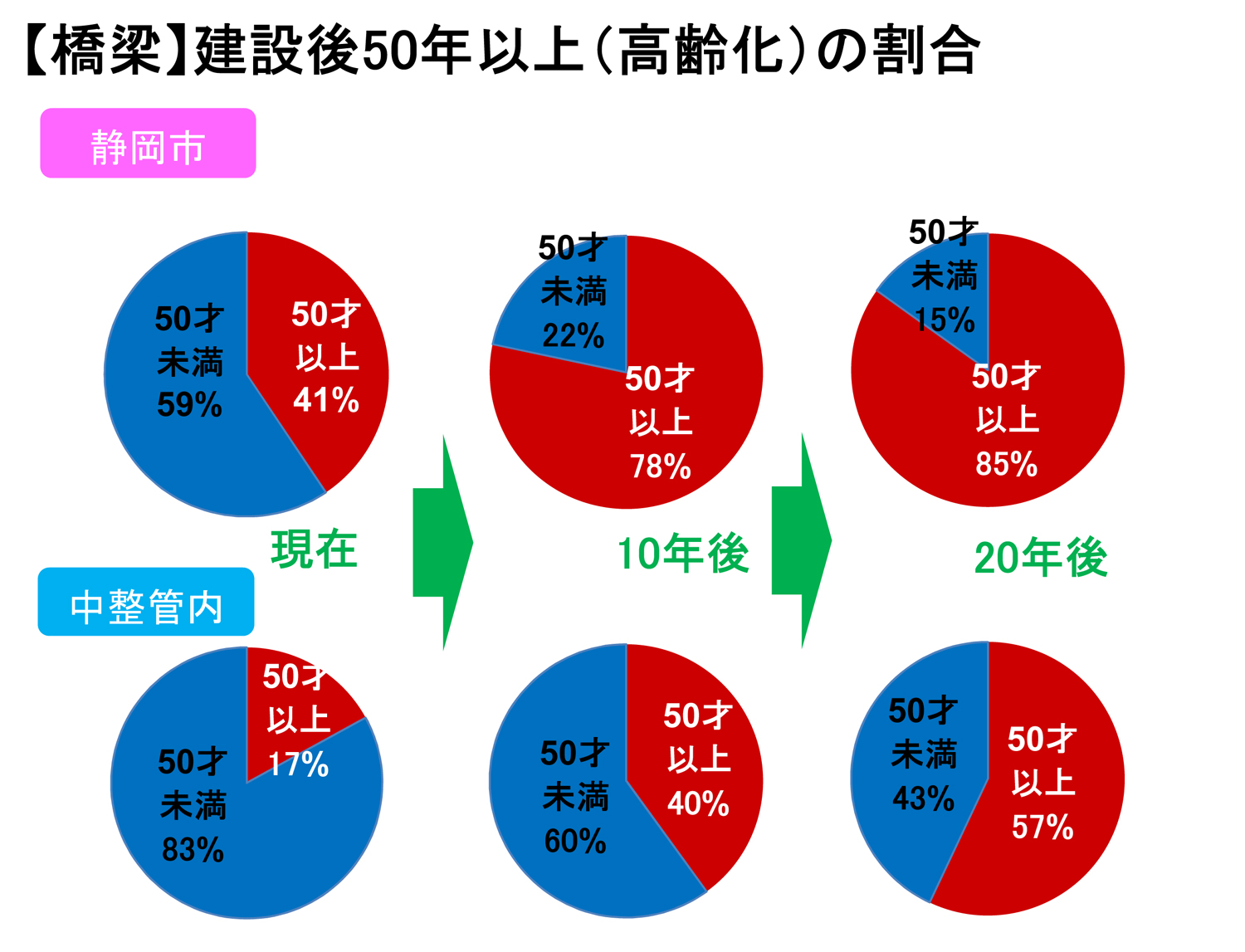 柴 本市の管理する橋梁は2,648橋あり、橋種別内訳は鋼橋324橋、PC橋367橋、その他RC橋など1,957橋となっています。供用年次別では51年以上の割合が40.6%(1,076橋)に達しており。今後は高度成長期に造られた多くの橋梁が順次高齢化することで、10年後には998橋が新たに橋齢50年を迎えることになり、78%が供用50年以上のいわゆる高齢橋(下円グラフ)になります。しっかりとした計画と保全が必要です。