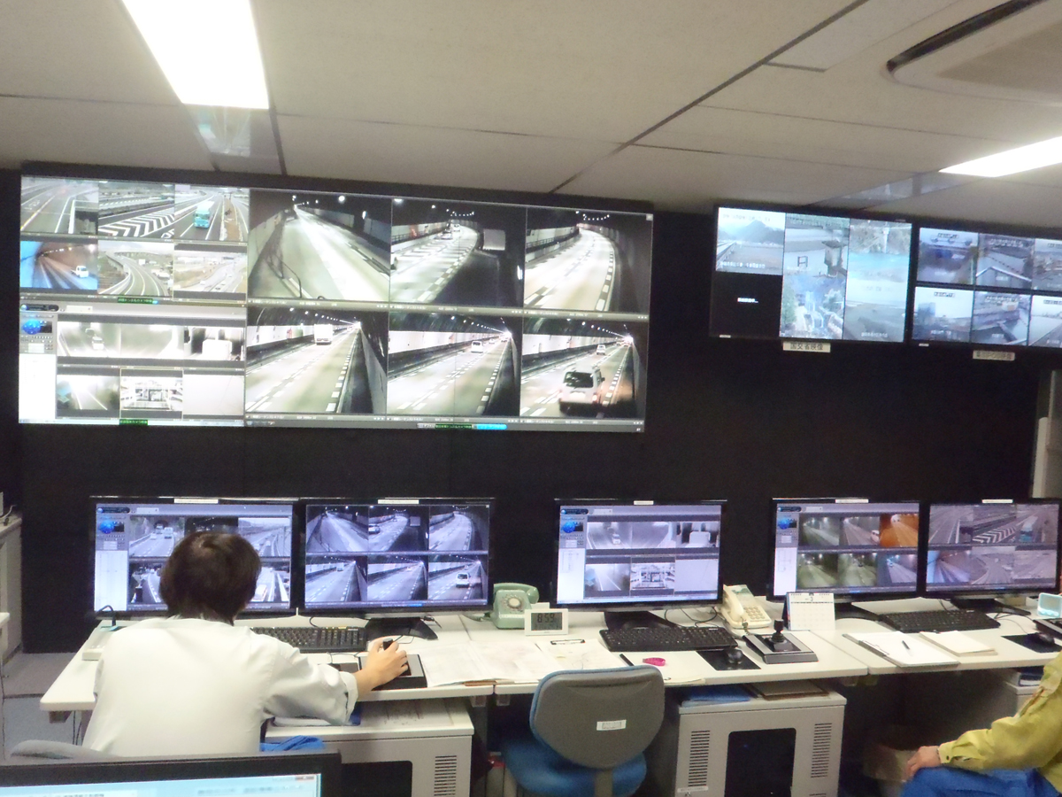 新日本坂トンネルの点検(左)、坑口状況(中)、土木施設監視センター(右)