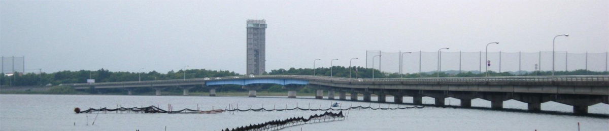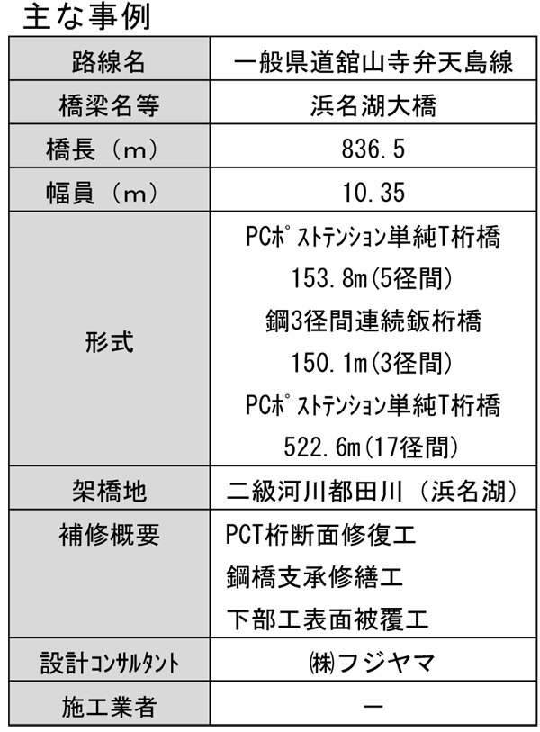同橋は1973年(昭和48年)に有料道路の一部として建設された橋長836.5㍍のPC・鋼複合橋で、03年に静岡県道路公社から一般県道として移管され、浜松市の政令都市化に伴い、引き継いだものです。その名の通り、浜名湖上を走る橋梁で、径間数は実に25に達します。今回はPCT桁部分(22径間、676.4㍍)の断面修復工(数量未定、左官工法)、鋼橋部(150.1㍍、3径間)の支承修繕工、下部工の表面被覆工(数量未定、塗装工法)を施工する予定です。