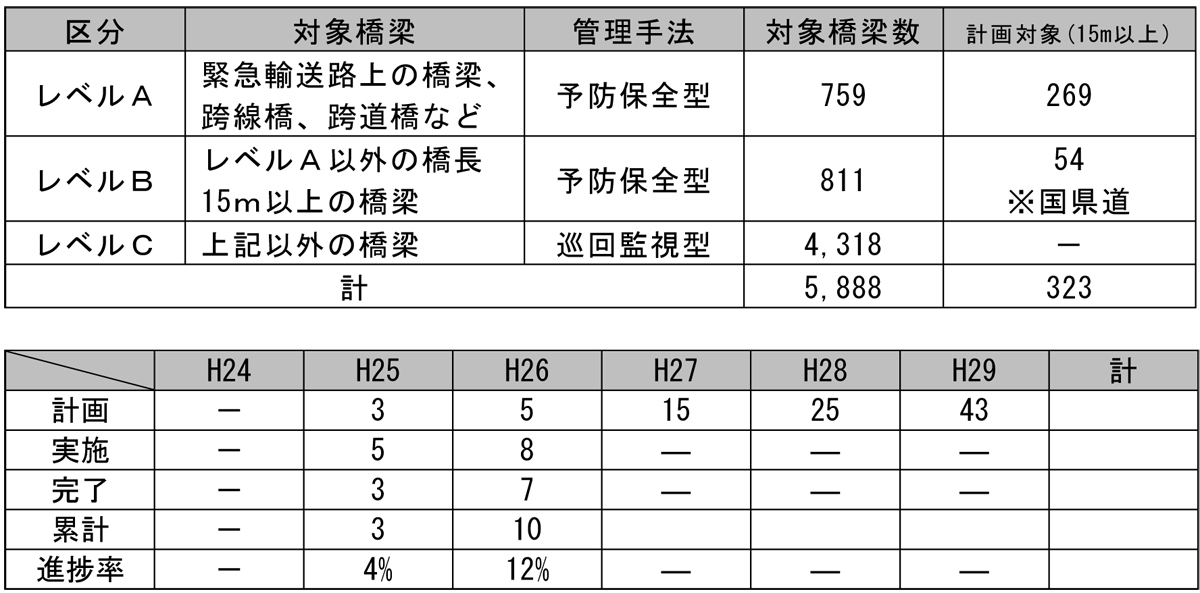 黒田 市では、平成23年度に橋梁長寿命化修繕計画を策定しました。計画はリスクベースメンテナンスの考え方により、緊急輸送路など重要度の高い橋梁約1,600橋を予防保全型管理として位置付けて、このうち橋長15㍍以上の323橋を対象としています。点検結果から補修が必要と判断された橋梁82橋について、25年度から修繕を進めており、26年度末では10橋が完了(進捗率12%)した状況に留まっています。