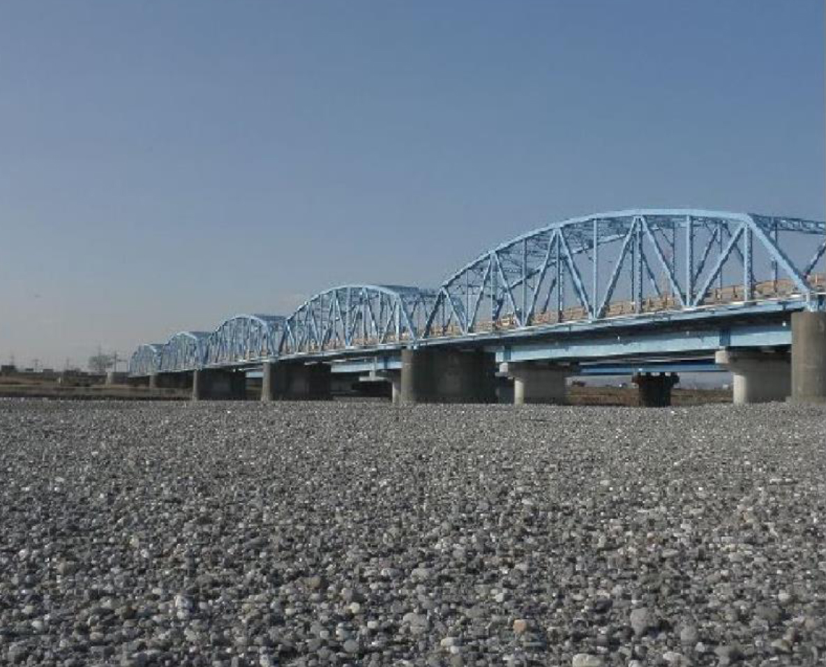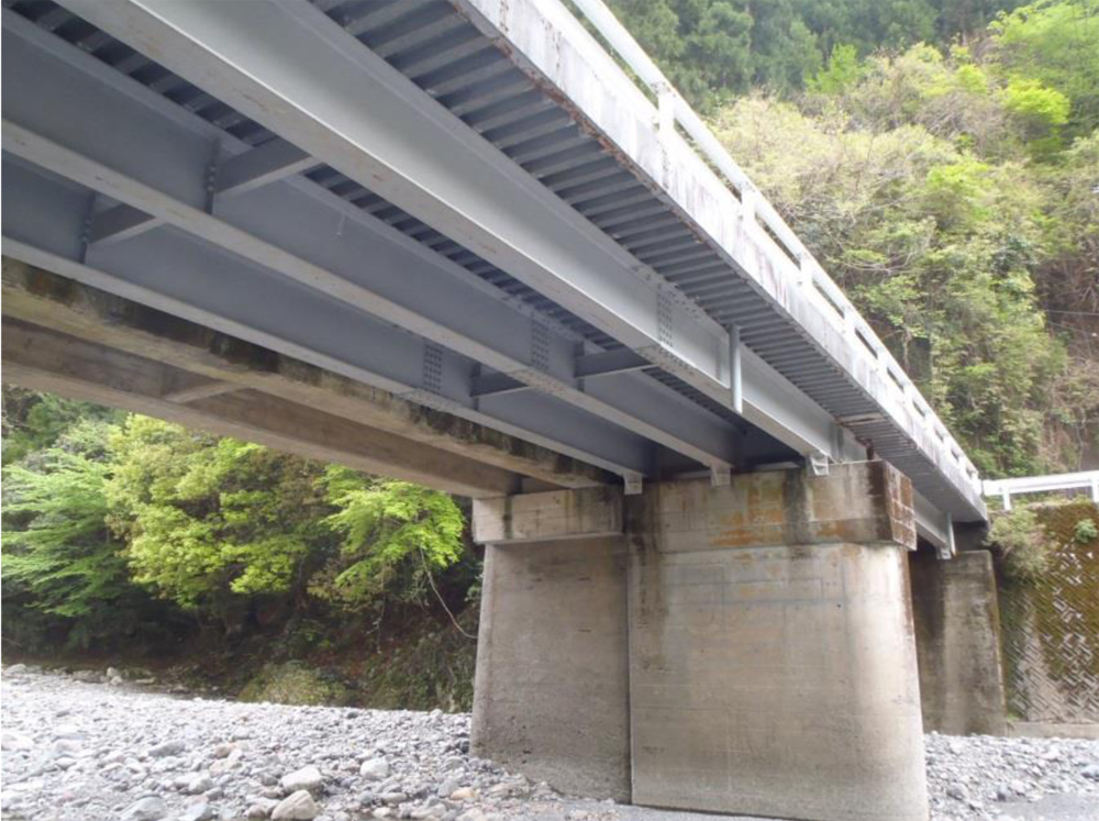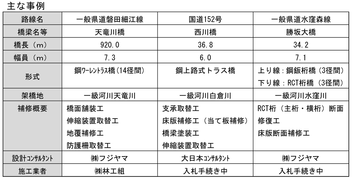 黒田 27年度で申し上げますと、一般県道磐田細江線の天竜川橋(920㍍、鋼14径間ワーレントラス橋)、国道152号の西川橋(36.8㍍、鋼上路式トラス橋)、一般県道水窪森線勝坂大橋上下線(34.2㍍、上り線は3径間鋼鈑桁、下り線は3径間RCT桁)などを補修補強しています。天竜川橋は、その名の通り一級河川天竜川を渡河する1㌔近い長大橋ですが、今回は橋面舗装工(1,410㎡)、伸縮装置の取替え(2箇所、荷重支持型鋼製ジョイント)、地覆や防護柵の補修工事を行っています。西川橋や勝坂大橋については床版の補修や支承の取替、橋梁の塗り替え(1,489㎡、3種ケレン)などを行う予定です。