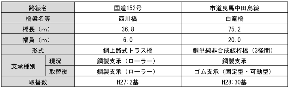 黒田 支承取替は、27年度は国道152号西川(さいがわ)橋で施工しております。西川橋は現状と同様の鋼製支承に交換します。28年度は市道曳馬中田島線白竜橋(75.2㍍、鋼単純非合成鈑桁×3連)で30基の支承交換を予定しています。いずれも鋼製支承をゴム支承に取り替えるものです。