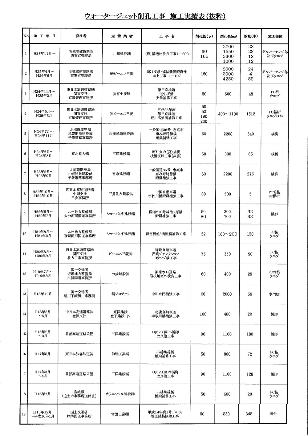 ――ウォータージェット(以下WJ)の削孔というと、平成15年末に現場取材した久野製作所が静岡国道管内の橋梁(国道1号巴川橋)の橋台に落橋防止装置をセットするためのアンカーボルト設置用の削孔をした第一号案件を思い出します。用途としてはやはり、そうした方面ですか