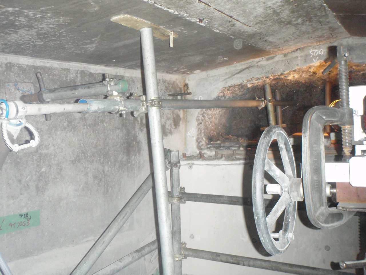 久野 削孔長は最長で4,250㍉(PC桁のウエブ)の実績があります。水圧や水量を調整すればそれ以上の厚さでも削孔可能です。径は50㍉程度まで絞ることが可能です。過去にはPCケーブルのシース間の中のグラウト充填不良による腐食、破断を調査する際に桁の横からPC鋼線を切断せずに点検用の穴を削孔するため使われたケースがあります。