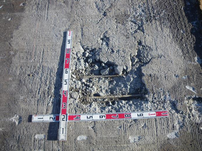 左から橋面の轍状況、床版上面の土砂化・鉄筋腐食、床版下面の1方向貫通ひび割れ、床版コンクリート復旧