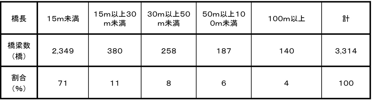 橋長別は15㍍未満が2,349橋、15㍍以上100㍍未満が825橋、100㍍以上が140橋となっています。