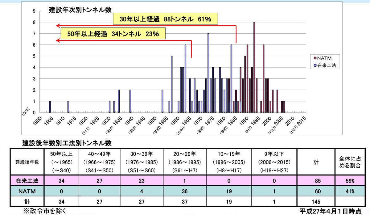 供用年次別内訳は、供用後50年を経過しているものが34箇所で23%となっています。次いで40年以上50年未満は27カ所でこの61箇所は全て在来工法です。30年以上40年未満は27箇所(在来23、NATM4)で30年以上のトンネルは押し並べて在来工法により施工されたものが多く、今後の変状対策、設備更新を計画的に実施していく予算の確保が課題です。