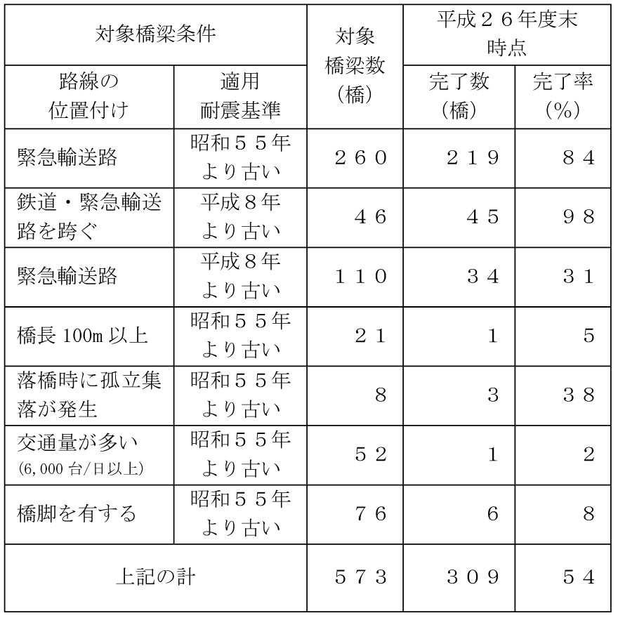 平野 大規模災害発生時に、救急・救命活動や支援物資の輸送、復旧・復興活動を迅速に行うため、「静岡県地震・津波対策アクションプログラム2013」に基づき、緊急輸送路を始めとした橋梁の耐震対策を実施しています。平成34年度末までに重要路線などにある573橋について耐震対策を完了させる予定です(右表)。26年度末までに309橋が完了しており、27年度末にはさらに20橋で対策を完了させました。41橋中7橋で落橋防止装置(鋼製ブラケットタイプ)を設置しています。