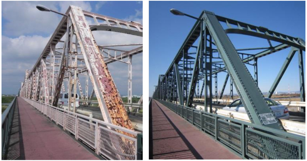 平成27年度は、国道150号の掛塚橋など6橋で工事を行っています。掛塚橋は昭和30年(1955年)に架設された15径間の鋼トラス橋であり、鋼材の亀裂、腐食による断面欠損などが確認されたことから、早急に補修を行う必要が生じました。具体的には当て板補修、塗替塗装(24,910平方㍍)を行っています。