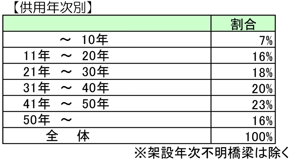 供用年次別は50年以上経過している橋梁が16%、41~50年未満が23%、31~40年が20%となっています。20年経過後は橋齢50年を経過した橋梁が全体の6割に達します。