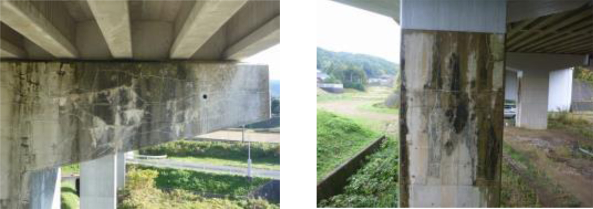 ASRによる損傷(左)橋脚梁部、(右)柱部