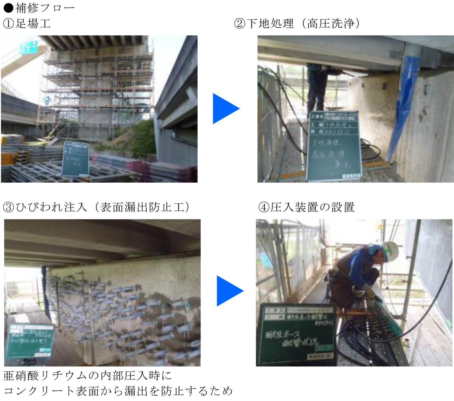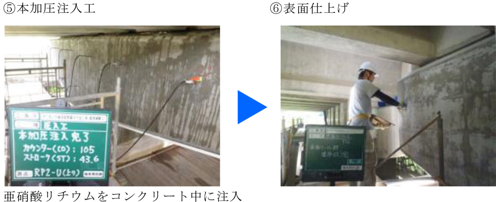 永石 塩害は玄海灘に面している30橋、アルカリ骨材反応による劣化は県内全域で53橋でそれぞれ認められ、詳細調査が必要な橋梁があります。対策方法としては亜硝酸リチウムを注入する(ASRリチウム)工法やASRのこれ以上の進展を防ぐため、水の浸入抑制を目的に表面含浸材の塗布などを実施しています。