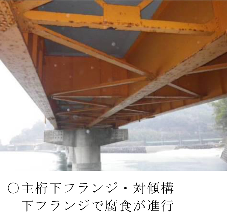 永石 状況としては、コンクリート橋では上部工の主構のひび割れや、コンクリートの剥離、鉄筋露出などが生じています。鋼橋では塗装劣化や腐食などが生じています。絶対数としてはコンクリート橋の損傷の方が多いですが、各橋種別の損傷割合としては鋼橋が比較的高くなっています。