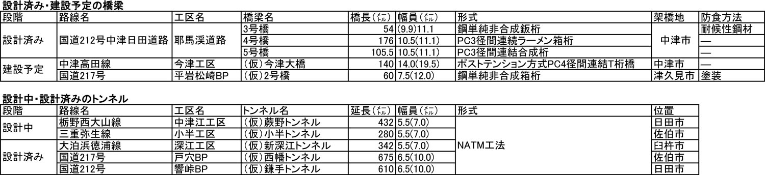 設計中・設計済み・建設予定の橋梁およびトンネル