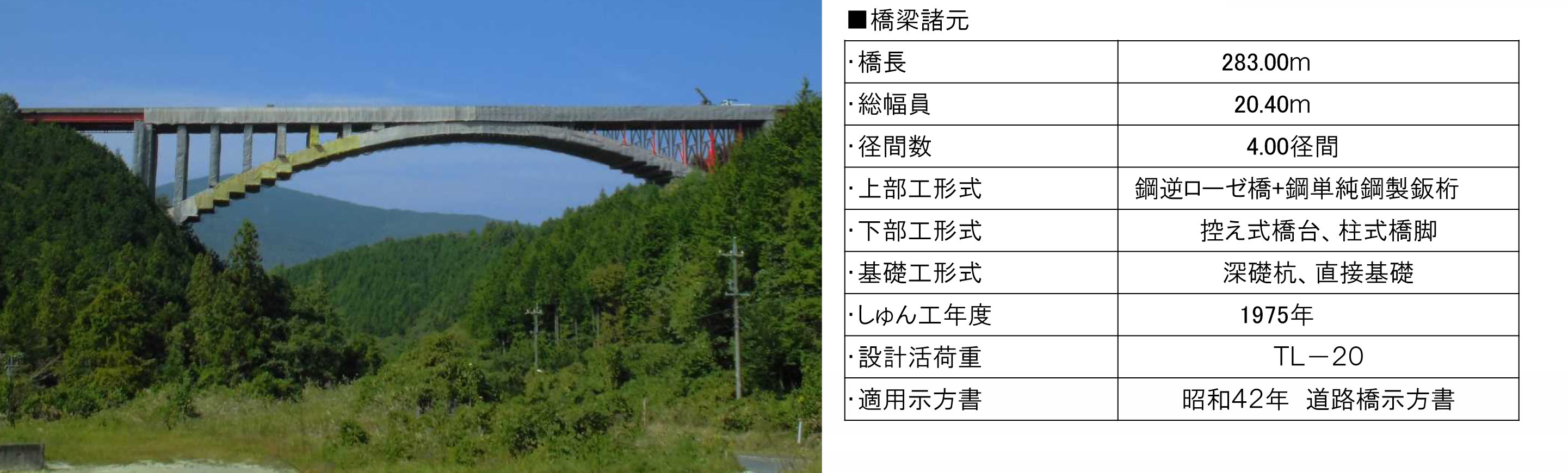 落合川橋は橋長283㍍、総幅員20㍍の鋼逆ローゼ桁+鋼単純鈑桁橋で上部工の耐震補強を行っています(右図および写真)。耐震照査を行った結果、橋軸方向においてアーチクラウン部の降伏、アーチ橋両端から2本目までの鉛直材や補剛桁の降伏、橋軸直角方向でアーチ橋両端から2本目までの鉛直材や鉛直材端部が降伏、またアーチ支点に大きな上揚力が発生するなどの解析結果となり、そのため、アーチクラウン部や鉛直材については当て板補強、鉛直材端部には低降伏点型せん断パネルを設置、アーチアバットとアーチリブ及び横支材(新設)についてはPCケーブルで連結することにより上揚力に抵抗させる対策をとりました。また、補剛桁の降伏対策としては、P1橋台に低降伏点型鋼製せん断パネルを設置することで対応しています。合わせて単純桁部分も支承を免震タイプに取り替えるとともに落橋防止装置としてPCケーブルを設置しています。工事は2014年7月から開始しており今年の11月にも完成予定です。工事の施行者はショーボンド建設株式会社です。