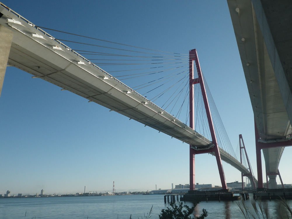 猪熊 名港トリトンは西大橋のⅠ期線(上り線、右写真)から上部工の補強に入ります。橋長758㍍、全幅員16㍍の3径間連続鋼斜張橋で同地に則した地震波を入れて現状を照査すると橋軸方向で桁衝突(飛島高架橋側)、水平支承の変位超過、主塔柱や主桁の塑性化、既存弾性拘束ケーブルの降伏が起き、橋軸直角方向ではウインド沓および水平沓の耐力超過、主塔および主桁の塑性化が起きるため、大規模なダンパーの設置や免震支承への取替、主桁断面の補強が必要になります。2016年秋ごろに事業が本格化します。