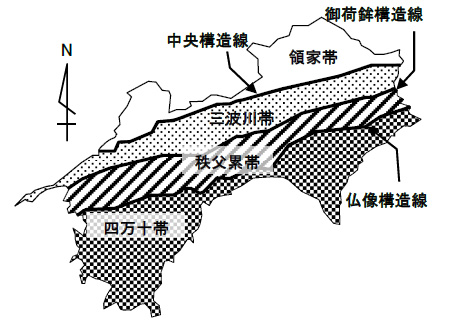 地質的な特徴は、ほぼ東西に走る御荷鉾構造線と仏像構造線の2つにより分断され、北側から三波川帯、中央部に秩父累帯および南側に四万十帯とに分かれています。特に四万十帯が本県の約6割を占め、その地質は、他の地質帯と比べて単調な砂岩や泥岩ですが、御荷鉾構造線を中心とした両側では地滑りが集中しています。