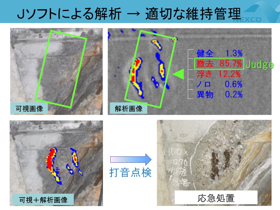 河野 赤外線カメラを用いてコンクリートの健全状況を診断する「Jシステム」があります。近接目視や打音検査に先立ちスクリーニングを行うために使っているもので、これを使うことで変状想定箇所を絞り込み、打音検査の作業を軽減することができます。