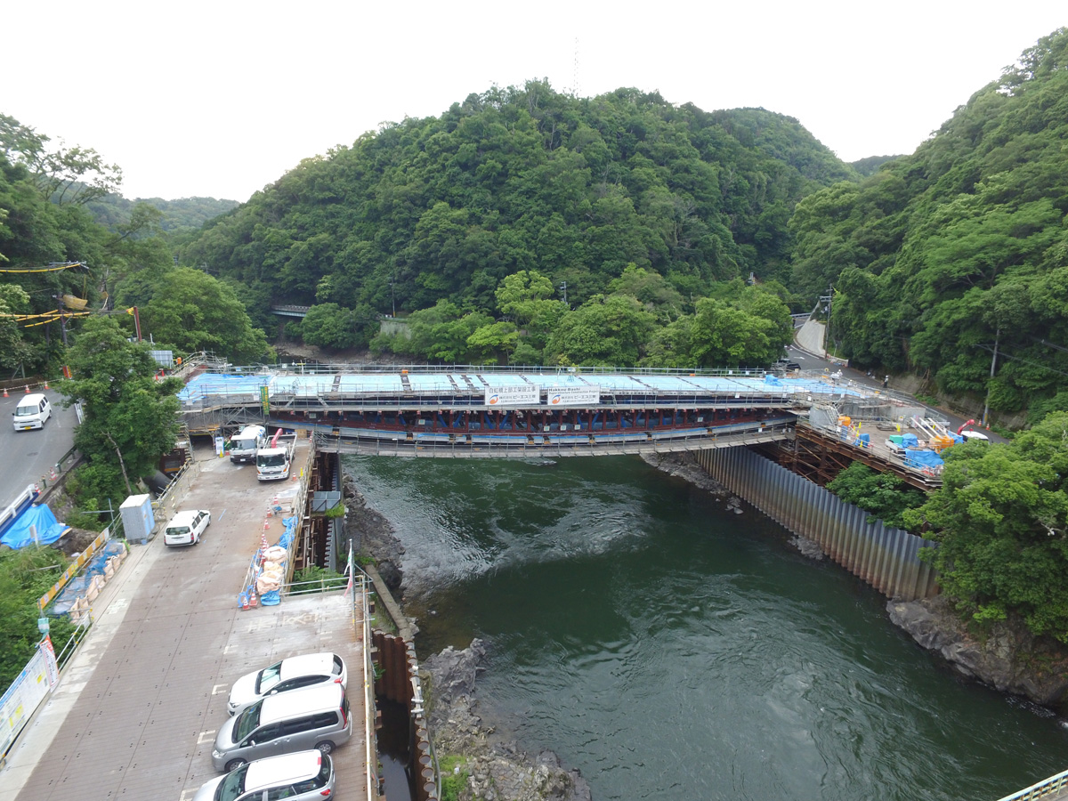 新設橋では、白虹橋があります。自然景観と調和した橋梁で、宇治の平等院から近く市民の散策コース近くに建設されています。ドローンを使用して水面との距離を測りながら施工していました。他にも北海道では、札樽道朝里川橋(NEXCO東日本)など長大橋の建設工事を進めています。